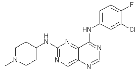 The reaction of 5-bromo-2-(methylsulfanyl)pyrimidine-4-carboxylic acid (I) with ammonia and CuSO4 in water gives 5-amino-2-(methylsulfanyl)pyrimidine-4-carboxylic acid (II), which is cyclized with formamide or formamidine acetate by heating at 180 C to yield 4-hydroxy-6-(methylsulfanyl)pyrimido[5,4-d]pyrimidine (III). The reaction of (III) with refluxing SOCl2 affords the corresponding 4-chloro derivative (IV), which is condensed with 3-chloro-4-fluoroaniline (V) in hot dioxane to provide the secondary amine (VI). Alternatively, (VI) can also be obtained by direct condensation of the 4-hydroxy compound (III) with aniline (V) by means of HMDS and Ts-OH at 140 ?C. The oxidation of the sulfanyl group of (VI) with MCPBA in dichloromethane provides a mixture of the sulfinyl derivative (VII) and the sulfonyl derivative (VIII), which, without isolation, is finally condensed with 1-methylpiperidin-4-amine (IX) by means of DIEA in hot DMF to give the target pyrimido-pyrimidine-diamine.