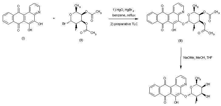 Coupling of alizarin blue (I) with the pyranosyl bromide (II) under Koenigs-Knorr conditions in the presence of HgO and HgBr2 afforded the target 5-talopyranoside derivative (III) along with minor amounts of the 5,6-bis-talopyranoside, which were separated by preparative thin layer chromatography. Deacetylation of (III) using NaOMe in MeOH-THF then gave the title compound.