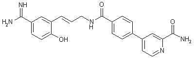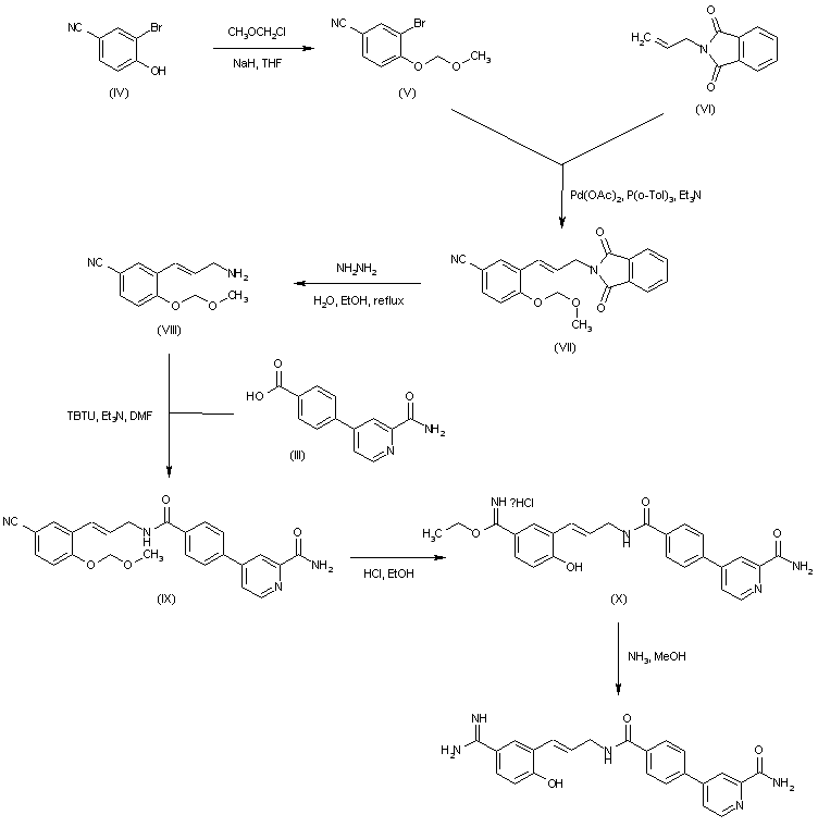 3-Bromo-4-hydroxybenzonitrile (IV) was protected as the methoxymethyl ether (V). Subsequent Heck reaction with N-allyl phthalimide (VI) produced adduct (VII). The phthaloyl group OF (VII) was then removed by hydrazinolysis to yield the primary amine (VIII), which was coupled with carboxylic acid (III) using TBTU to afford amide (IX). Pinner reaction of (IX) with concomitant methoxymethyl group deprotection gave imidate (X). Finally, ammonolysis of the imidate group of (X) furnished the title amidine.