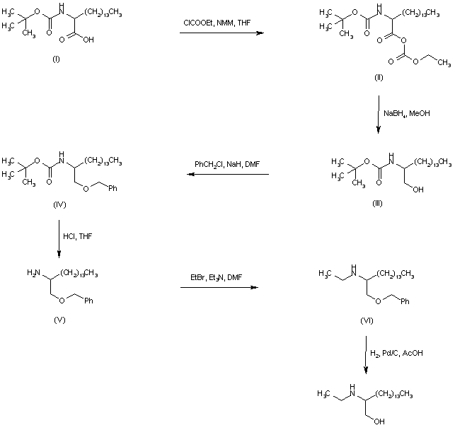 N-Boc-2-Aminohexadecanoic acid (I) was reduced to the Boc-aminoalcohol (III) via conversion to the mixed anhydride (II), which was subsequently reduced with NaBH4. Alcohol (III) was protected as the benzyl ether (IV) by alkylation with benzyl chloride in the presence of NaH. After acid deprotection of the N-Boc group of (IV), the resultant primary amine (V) was monoalkylated with ethyl bromide under controlled conditions to afford (VI). Finally, hydrogenolysis of the benzyl ether function of (VI) over Pd/C furnished the title amino alcohol.