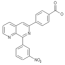 In an alternative synthetic procedure, dinitrile (VII) was cyclized in the presence of sodium methoxide to produce 6-amino-8-methoxy-1,7-naphthyridine (XII). This was converted to triflate (XIII) by diazotization in the presence of trifluoromethanesulfonic acid. Suzuki coupling of triflate (XIII) with 4 carboxyphenylboronic acid (XI) yielded adduct (XIV). The 8-methoxy group of (XIV) was then displaced with PBr3 to produce bromide (XV), which was subjected to further Suzuki coupling with the benzofurazan boronic acid (V) to provide the title compound.