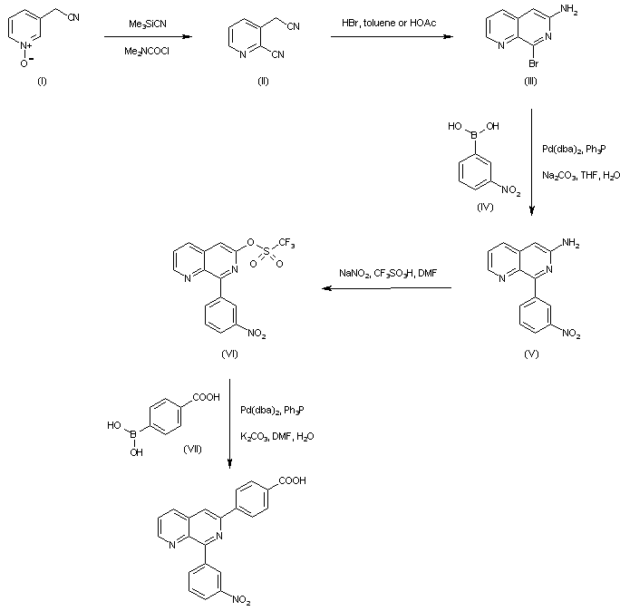 Reaction of 3-(cyanomethyl)pyridine-N-oxide (I) with cyanotrimethylsilane and dimethylcarbamoyl chloride provided dinitrile (II). Subsequent cyclization of (II) in the presence of HBr gave rise to 6-amino-8-bromo-1,7-naphthyridine (III). Attachment of a 3-nitrophenyl group to (III) to afford (V) was carried out by Suzuki coupling of (III) with 3-nitrophenylboronic acid (IV) in the presence of bis(dibenzylideneacetone)palladium and triphenylphosphine. The required triflate (VI) was then obtained by nitrosation of aminonaphthyridine (V) in trifluromethanesulfonic acid/DMF. Finally, a second Suzuki coupling of (VI) with 4-carboxyphenylboronic acid (VII) provided the title 6,8-diarylnaphthyridine.