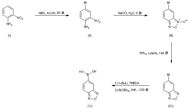 The precursor benzofurazan boronic acid (V) was prepared as follows. Bromination of o-nitroaniline (I) by means of N-bromosuccinimide in AcOH afforded 4-bromo-2-nitroaniline (II). Treatment of (II) with NaOCl gave rise to the 5 bromobenzofurazan N-oxide (III), which was reduced to (IV) employing triphenylphosphine in boiling xylene. Then, lithiation of (IV), followed by reaction with triethyl borate furnished the target boronic acid (V).
