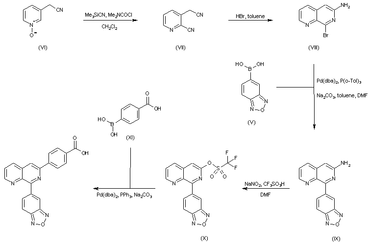3-(Cyanomethyl)pyridine-N-oxide (VI) was converted to the pyridine dinitrile (VII) by treatment with cyanotrimethylsilane and dimethylcarbamoyl chloride. Cyclization of dinitrile (VII) in the presence of HBr gave rise to 6-amino-8-bromo-1,7-naphthyridine (VIII). Attachment of the benzofurazanyl moiety to (VIII) was performed by Suzuki coupling with boronic acid (V) in the presence of bis(dibenzylideneacetone)palladium and tri(o-tolyl)phosphine. The resultant 6 amino-8-aryl naphthyridine (IX) was subjected to diazotization in the presence of trifluoromethanesulfonic acid to furnish triflate (X). Further Suzuki coupling of triflate (X) with 4-carboxyphenylboronic acid (XI) led to the title compound.