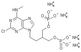 The sodium salt of triethyl methanetricarboxylate (I) was alkylated with 1,2-dibromoethane (II) to afford bromide (III). Subsequent condensation of 6-(methylamino)-2-chloropurine (IV) with bromide (III) in the presence of K2CO3 gave adduct (V). Mono-decarbethoxylation of tricarboxylate (V) upon treatment with NaOMe produced malonate (VI), which was further reduced to diol (VII) by means of NaBH4 in CH2Cl2-MeOH. Treatment of (VII) with tetrabenzyl pyrophosphate in the presence of LDA gave rise to the bis-phosphate ester (VIII). The benzyl groups of (VIII) were then cleaved employing boron trichloride, and the resulting phosphoric acid was purified through an ion-exchange resin in the presence of ammonium bicarbonate to furnish the title tetraammonium salt.