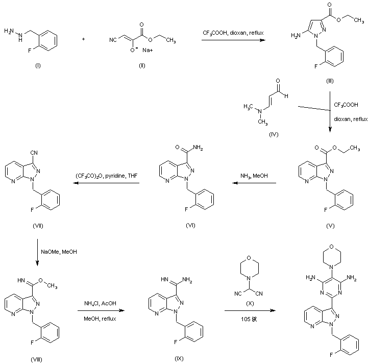 The condensation between 2-fluorobenzylhydrazine (I) and the sodium enolate of ethyl cyanopyruvate (II) in the presence of trifluoroacetic acid produced the pyrazole derivative (III). Subsequent cyclization of aminopyrazole (III) with (dimethylamino)acrolein (IV) gave the pyrazolopyridine (V). Amonolysis of the ethyl ester group of (V) afforded amide (VI), which was further dehydrated to nitrile (VII) by means of trifluoroacetic anhydride and pyridine. Addition of sodium methoxide to nitrile (VII) furnished imidate (VIII). This was converted to the corresponding amidine (IX) upon treatment with ammonium chloride and HOAc. Finally, the title diamino pyrimidine compound was obtained by heating a mixture of amidine (IX) and morpholinomalononitrile (X).