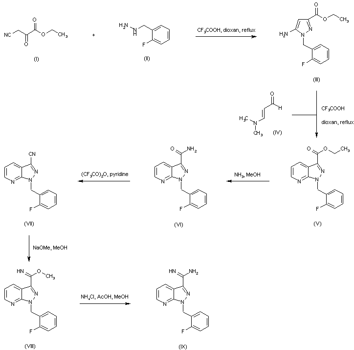 The condensation of ethyl cyanopyruvate (I) with 2-fluorobenzyl hydrazine (II) in the presence of trifluoroacetic acid produced the aminopyrazole (III). This was further condensed with (dimethylamino)acrolein (IV) under acidic conditions to furnish the pyrazolopyridine (V). The ethyl ester group of (V) was then converted to nitrile (VII) via formation of the corresponding amide (VI), followed by dehydration with trifluoroacetic anhydride. Addition of methoxide to the cyano group of (VII) produced imidate (VIII), which was treated with ammonium chloride to yield the amidine (IX).