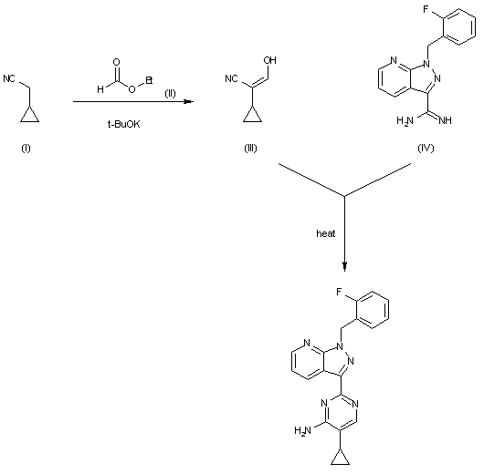 The reaction of 2-cyclopropylacetonitrile (I) with ethyl formate (II) by means of t-BuOK in THF gives the hydroxymethylene derivative (III), which is cyclized with 1-(2-fluorobenzyl)pyrazolo[3,4-b]pyridine-3-carboxamidine (IV)(see scheme no. 28591301a, intermediate (IX)) by heating at 105 C to afford the target aminopyrimidine derivative.