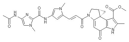 | 合成路线图解说明: The pyrrolecarboxylic acid derivative (I) was treated with BOP reagent, and the resulting hydroxybenzotriazolyl ester was reduced in situ with NaBH4 to furnish alcohol (II). Oxidation of (II) by means of activated MnO2 produced aldehyde (III). Wadsworth-Emmons reaction of aldehyde (III) with triethylphosphonoacetate gave rise to the unsaturated ester (IV). After basic hydrolysis of the ester group of (IV), the resultant carboxylic acid (V) was activated as the imidazolide (VI) upon treatment with carbonyldiimidazole. This was finally coupled with the segment A of DU86 (VII) in the presence of NaH in DMF at low temperature to yield the target amide. |