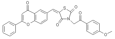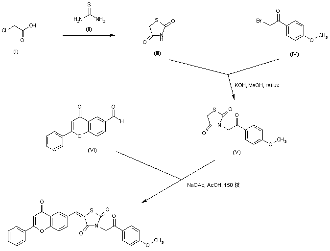 Thiazolidinedione (III) was prepared by condensation of chloroacetic acid (I) with thiourea (II). Alkylation of the potassium salt of (III) with 4-methoxyphenacyl bromide (IV) furnished the 3-phenacyl thiazolidinedione (V). Finally, aldol condensation of (V) with flavone-6-carboxaldehyde (VI) in the presence of NaOAc in HOAc provided the title compound.
