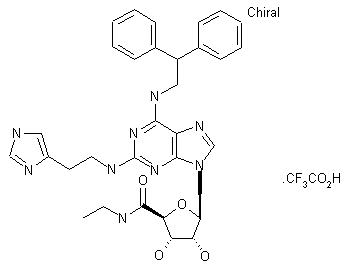 Protection of the 2',3'-diol group of adenosine (VII) as the corresponding acetonide (XII) was effected by treatment with 2,2-dimethoxypropane and p-toluenesulfonic acid. The primary alcohol group of (XII) was then oxidized to carboxylic acid (XIII) using KMnO4. After conversion of (XIII) to acid chloride by means of refluxing SOCl2, coupling with ethylamine furnished amide (XIV). Displacement of the 2-chloro of (XIV) by histamine (XV) in hot DMSO produced adduct (XVI). The acetonide group of (XVI) was finally deprotected using aqueous trifluoroacetic acid.