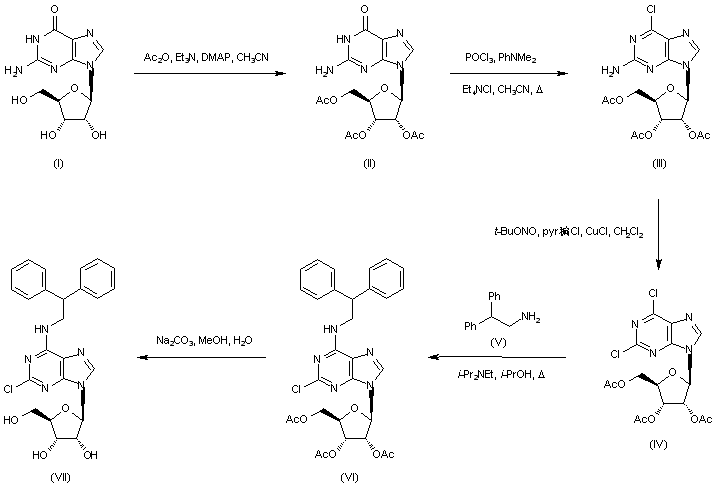 Guanosine (I) was protected as the triacetate ester (II) and then chlorinated with POCl3 in the presence of dimethylaniline and tetraethylammonium chloride to give the 6-chloro derivative (III). Diazotization of (III) with tert-butyl nitrite, followed by a modified Sandmeyer reaction provided dichloro purine (IV). Substitution of the 6-chloro of (IV) by 2,2-diphenylethylamine (V) in the presence of diisopropylethylamine in refluxing isopropanol furnished the chloroadenosine derivative (VI), and subsequent removal of the acetate protecting groups of (VI) by hydrolysis with Na2CO3 in aqueous MeOH yielded the adenosine derivative (VII).