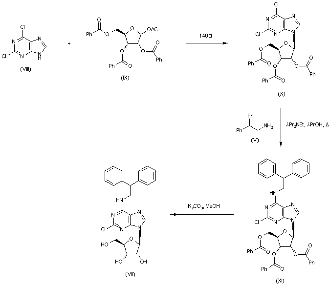 Alternatively, condensation of 2,6-dichloropurine (VIII) with protected ribose (IX) at 140 C gave the ribofuranosyl purine (X). Subsequent displacement of the 6-chloro of (V) by amine (V), followed by hydrolysis of the benzoate esters afforded the intermediate (VII).