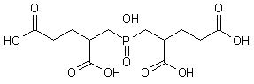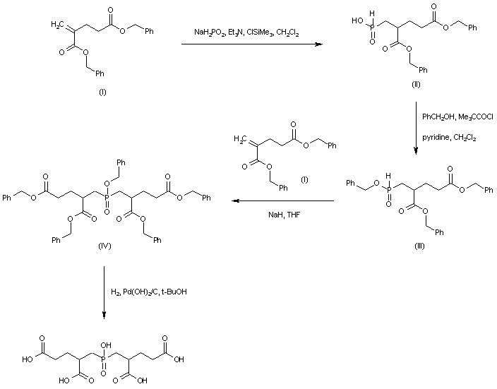Conjugate addition of sodium hypophosphite to dibenzyl alpha-methyleneglutarate (I) afforded the phosphonate (II), which was converted to the benzyl-protected compound (III) by treatment with benzyl alcohol in the presence of pivaloyl chloride. Deprotonation of (III) with NaH followed by conjugate addition to (I) provided the pentabenzyl ester (IV). Finally, hydrogenolysis of the benzyl ester groups of (IV) using H2 over palladium hydroxide gave rise to the title compound.