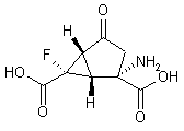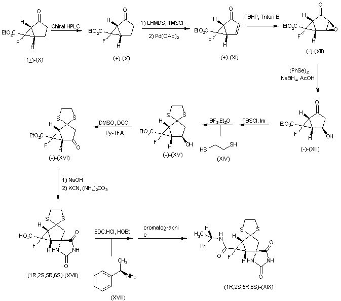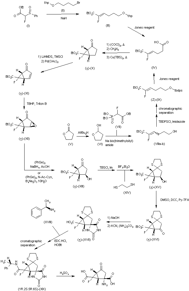 Coupling of ethyl phenylsulfinylfluoro acetate (I) with bromo derivative (II) by means of NaH in DMF yields ethyl hexenoate (III), which is then oxidized by means of Jones reagent in acetone to provide 5-carboxy pentenoate derivative (IV). Alternatively, compound (IV) can be obtained as follows: eduction of gamma-butyrolactone (V) in THF with aluminum diisobutylhydride in toluene affords gamma-butyrolactol (VI), which is treated with ethyl (diethoxyphosphoryl)fluoroacetate (VII) and sodium bis(trimethylsilyl)amide in THF to provide an isomeric mixture of hexenoates (VIII). O-Protection of (VIII) by means of tert-butyldiphenylchlorosilane and imidazole in DMF followed by chromatographic separation of the geometrical isomers furnishes hexenoate (Z)-(IX), which is finally oxidized with Jones reagent in acetone. Conversion of carboxylic acid (IV) into bicycle (?-(X) is then performed by first reaction with oxalyl chloride in refluxing hexane to form the corresponding acid chloride, followed by treatment with diazomethane in ether and subsequent reaction with cooper(II) bis(N-tert-butylsalicylaldiimidate) in refluxing benzene. Treatment of oxobicycle (?-(X) with LiHMDS and chlorotrimethylsilane in THF followed by reaction with palladium acetate in acetonitrile gives 6-fluoro-2-oxobicyclo[3.1.0]hex-3-en-6-carboxylate (?-(XI), from which epoxide (?-(XII) is obtained by reaction in toluene with tert-butyl hydroxyperoxide (TBHP) and benzyltrimethylammoniumhydroxide (Triton B) in MeOH or EtOH. Epoxide reduction of (?-(XII) using diphenyl diselenide (PhSe)2 and sodium borohydride in the presence of HOAc in EtOH, or by means of (PhSe)2, N-acetyl-L-cysteine and sodium tetraborate decahydrate in H2O:EtOH, yields hydroxy derivative (?-(XIII), which is converted into ethylenedithio derivative (?-(XV) by first protection of the hydroxyl group with tert-butyldimethylsilyl chloride in DMF in the presence of imidazole, followed by thioketalization with 1,2-ethanedithiol (XIV) and boron trifluoride-diethylether complex in CHCl3 (with subsequent TBS group removal during work-up). Oxidation of the hydroxyl group of (?-(XV) with DMSO and dicyclohexylcarbodiimide (DCC) in the presence of pyridine and TFA gives ketone (?-(XVI), which is then hydrolyzed with NaOH in EtOH and subjected to reaction with KCN and ammonium carbonate (Bucherer-Bergs conditions) to yield hydantoin (?-(XVII). Coupling of (?-(XVII) with (R)-(+)-1-phenylethylamine using EDC-HCl and HOBt followed by chromatographic separation of the two resulting diastereomers furnishes (1R,2S,5R,6S)-(XIX), which is finally converted into the desired product after hydrolysis with H2SO4.