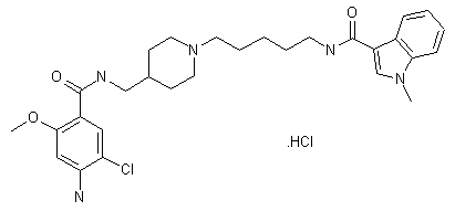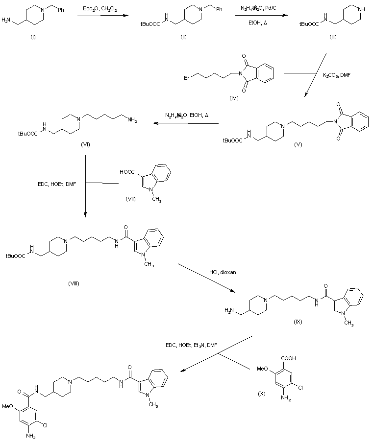 1-Benzyl-4-(aminomethyl)piperidine (I) was protected at the primary amino group as the Boc derivative (II) and the N-benzyl group was subsequently removed by transfer hydrogenolysis with hydrazine and Pd/C to give piperidine (III). Alkylation of (III) with N-(5-bromopentyl)phthalimide (IV) afforded (V), which was subjected to hydrazinolysis of the phthalimido group, yielding primary amine (VI). Coupling of (VI) with 1-methylindole-3-carboxylic acid (VII) by means of EDC and HOBt gave rise to amide (VIII). The Boc protecting group of (VIII) was then cleaved by acidic treatment to furnish amine (IX). Finally, coupling of (IX) with 4-amino-5-chloro-2-methoxybenzoic acid (X) provided the title benzamide.