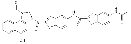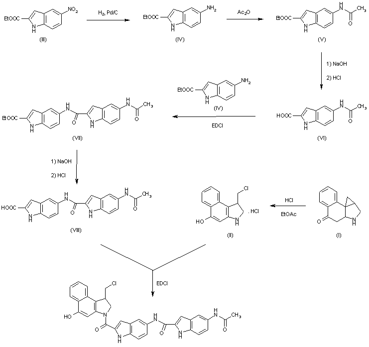 Treatment of the cyclopropabenzindole derivative (CBI) (I) with hydrochloric acid in ethyl acetate affords the chloromethyl derivative (II). The final step is the condensation of (II) with the acid (VIII) by means of 1-(3-dimethylaminopropyl)-3-ethylcarbodiimide (EDCI) in DMF. The acid (VIII) was prepared as follows: Ethyl 5-nitroindole-2-carboxylate (III) is reductively transformed to its corresponding amine (IV) by hydrogenation over Pd/C. The amine (IV) is then converted to its acetamido ester (V) by treatment with acetic anhydride in ethyl acetate. Ester (V) is then hydrolyzed using NaOH to afford the corresponding acid (VI), which is coupled to amine (IV) in the presence of EDCI to yield ester (VII). Finally (VII) is converted to acid (VIII) by treatment with NaOH.