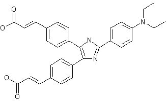 Coupling of tert-butyl acrylate (II) with 4,4'-dibromobenzyl (I) using palladium diacetate and tri-o-tolyl phosphine produced diester (III). Subsequent condensation of (III) with 4-(diethylamino)benzaldehyde (IV) in the presence of ammonium acetate generated the required imidazole system (V). Finally, deprotection of the tert-butyl esters of (V) by treatment with trifluoroacetic acid afforded the title dicarboxylic acid.