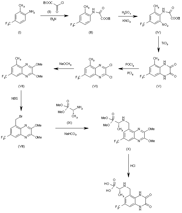 The reaction of 2-methyl-4-(trifluoromethyl)aniline (I) with ethoxalyl chloride (II) by means of triethylamine in ethyl acetate gives the oxamic ester (III), which is nitrated at the aromatic ring with KNO3 and H2SO4 yielding the intermediate (IV). The reductocyclization of (IV) by means of TiCl3 in acetone affords the quinoxalinedione (V), which is treated with PCl5 in refluxing POCl3 affording the dichloroquinoxaline (VI). The reaction of (VI) with sodium methoxide in refluxing methanol gives the dimethoxyquinoxaline (VII), which is brominated with NBS and AIBN in refluxing benzene yielding the bromomethyl quinoxaline (VIII). The condensation of (VIII) with dimethyl 1(S)-aminoethylphosphonate (IX) by means of NaHCO3 in DMF affords the phosphonate derivative (X), which is finally submitted to acid hydrolysis to provide the target compound.