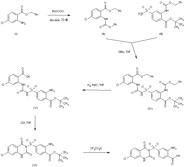 Benzyl 4-chloroanthranilate (I) is treated with phenyl chloroformate in hot dioxane to produce carbamate (II). Condensation between the phenyl carbamate (II) and sulfonamide (III) in the presence of DBU yields the sulfonyl urea (IV). The benzyl ester and N-benzyloxycarbonyl groups of (IV) are then removed by catalytic hydrogenolysis to furnish acid (V). Cyclization of (V) by means of CDI leads to the quinazolinedione (VI). Finally, the tert-butyl ester group of (VI) is cleaved by treatment with trifluoroacetic acid to provide the title compound