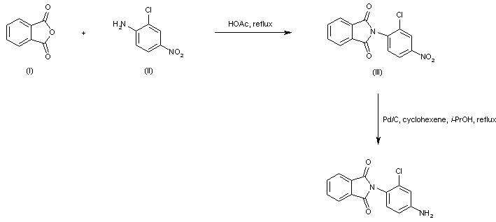 The condensation between 2-chloro-4-nitroaniline (II) and phthalic anhydride (I) in refluxing acetic acid produced phthalimide (III). The nitro group was then reduced to the desired aniline by transfer hydrogenation employing cyclohexene in the presence of Pd/C.