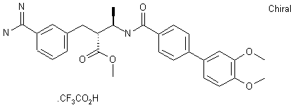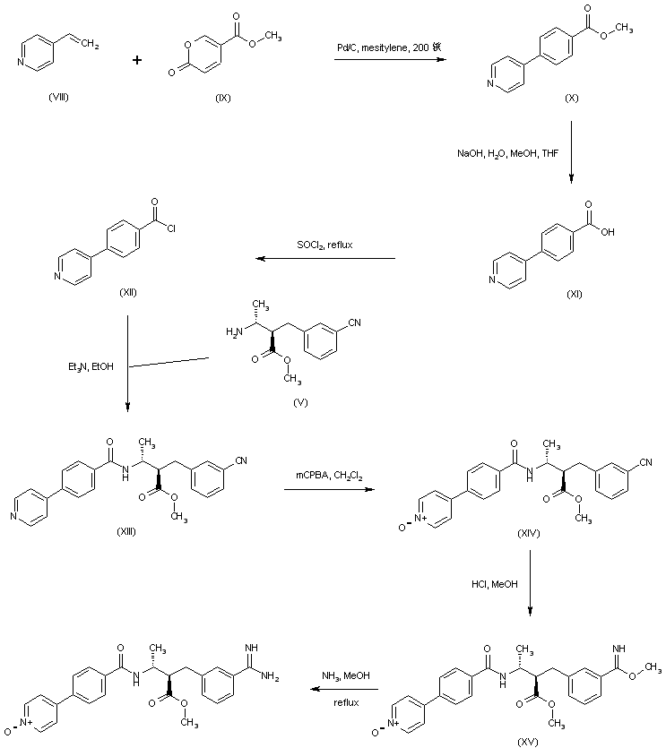 The cycloaddition reaction between 4-vinylpyridine (VIII) and methyl coumalate (IX) in hot mesitylene gives rise to the pyridyl benzoate (X). After saponification of the ester group of (X), the resultant carboxylic acid (XI) is converted to acid chloride (XII) by treatment with SOCl2. Acylation of amino ester (V) by acid chloride (XII) affords amide (XIII). The pyridine N of (XIII) is then oxidized to the corresponding N-oxide (XIV) employing m-chloroperbenzoic acid. Finally, conversion of the cyano group of (XIV) into the title amidine is accomplished by Pinner reaction, via formation of the intermediate imidate (XV), which is subsequently treated with methanolic ammonia.
