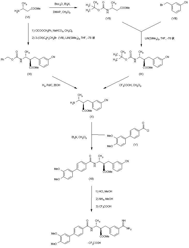 Protection of methyl (R)-3-aminobutyrate (VI) with di-tert-butyl dicarbonate provided the Boc derivative (VII), which was alkylated with 3-cyanobenzyl bromide (VIII) in the presence of lithium bis(trimethylsilyl)amide at -78 C to afford adduct (IX). Acid deprotection of the Boc group of (IX) yielded amino ester (X). Alternatively, (X) was obtained by protection of methyl 3-aminobutyrate (VI) with benzyl chloroformate, followed by alkylation with 3-cyanobenzyl bromide to give (XI). The carbobenzoxy group of (XI) was then deprotected by hydrogenation over Pd/C. Coupling of amino ester (X) with acid chloride (V) gave rise to amide (XII). Conversion of (XII) to the required amidine was then achieved by treatment with methanolic HCl, followed by reaction of the resulting imidate with ammonia in boiling MeOH. The title compound was isolated after conversion to the trifluoroacetate salt.