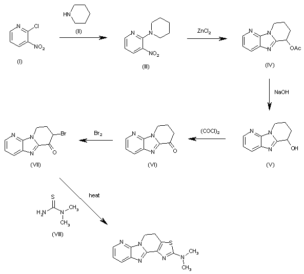 The reaction of 2-chloro-3-nitropyridine (I) with piperidine (II) in dichloromethane gives 3-nitro-2-(1-piperidinyl)pyridine (III), which is cyclized by means of anhydrous ZnCl2 in refluxing acetic acid yielding the acetoxy dipyridoimidazole (IV). The deacetylation of (IV) with NaOH in methanol affords the alcohol (V), which is oxidized with oxalyl chloride and DMSO in dichloromethane to give the ketone (VI). The bromination of (VI) with Br2 in hot aqueous HBr yields the alpha-bromoketone (VII), which is finally cyclized with N,N-dimethylthiourea (VIII) in refluxing ethanol.