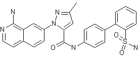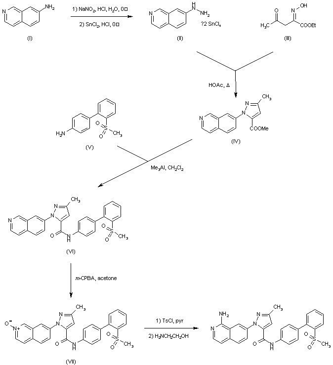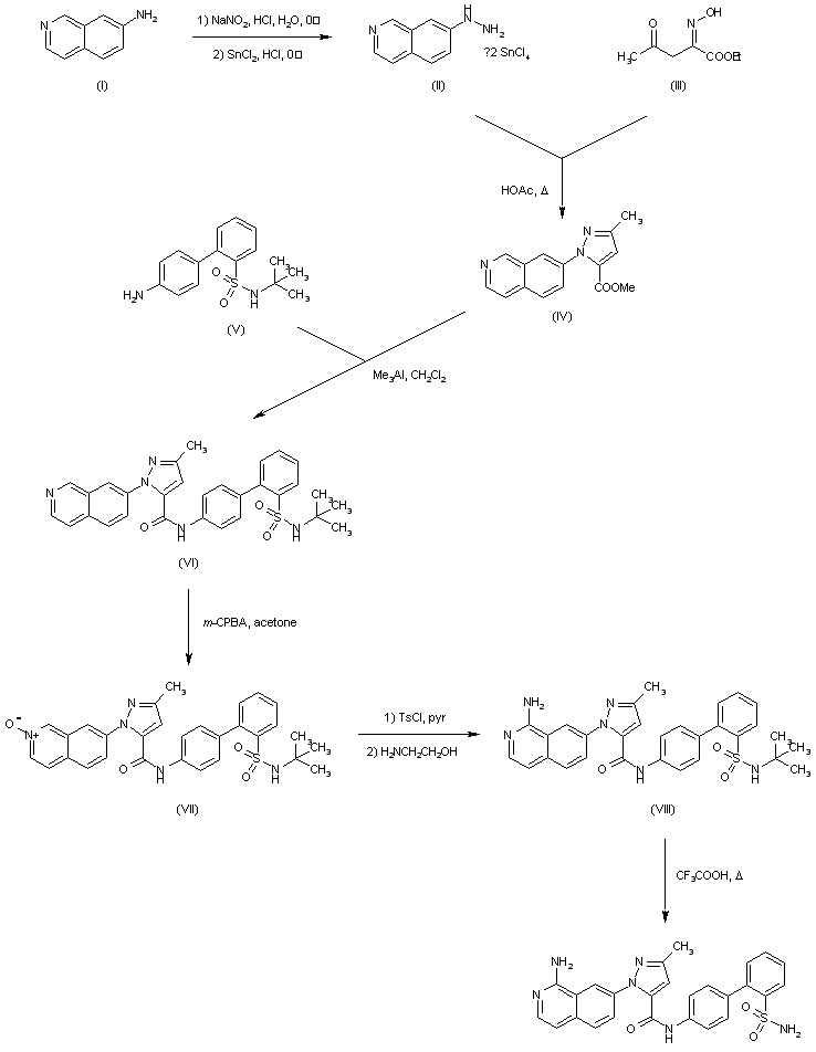 7-Aminoisoquinoline (I) was diazotized and then reduced with SnCl2 to afford the tin double salt of hydrazino isoquinoline (II), which was subsequently condensed with ethyl 2,4-dioxopentanoate oxime (III) yielding isoquinolinyl pyrazole (IV) as the major regioisomer. Displacement of the methyl ester group with biphenyl amine (V) in the presence of Me3Al furnished amide (VI). Introduction of the 1-amino moiety was accomplished via formation of the N-oxide (VII), followed by rearrangement with tosyl chloride and further displacement with ethanolamine. Finally, deprotection of the N-tert-butyl group with trifluoroacetic acid gave rise to the title compound.