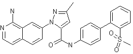 7-Aminoisoquinoline (I) was diazotized with NaNO2/HCl and then reduced with SnCl2 to afford the tin double salt of hydrazino isoquinoline (II), which was subsequently condensed with ethyl 2,4-dioxopentanoate oxime (III) yielding isoquinolinyl pyrazole (IV) as the major regioisomer. Displacement of the methyl ester group of (IV) with biphenyl amine (V) in the presence of Me3Al furnished amide (VI). Introduction in (VI) of the 1-amino moiety was accomplished via formation of the N-oxide (VII) with MCPBA, followed by rearrangement with tosyl chloride and finally displacement with ethanolamine.