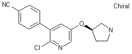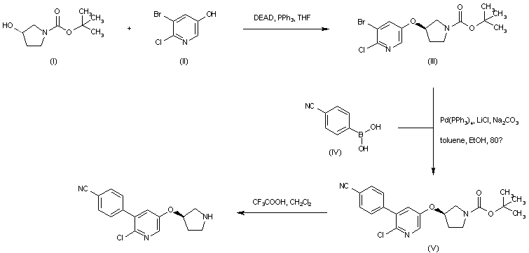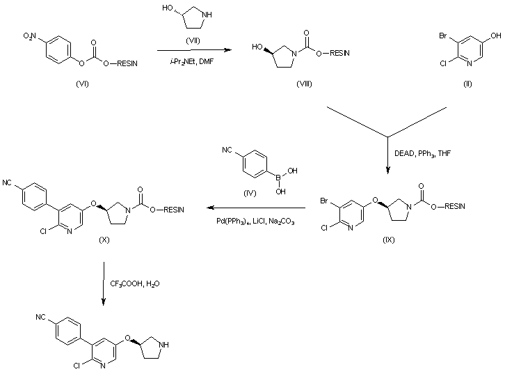 The compound has also been obtained by solid phase synthesis. Attachment of (S)-3-hydroxypyrrolidine (VII) to p-nitrophenylcarbonate Wang resin (VI) in the presence of diisopropylethylamine provided the resin bound pyrrolidinol (VIII). Coupling of (VIII) with 3-bromo-2-chloro-5-hydroxypyridine (II) under Mitsunobu conditions gave resin (IX). Further Suzuki coupling of (IX) with 4-cyanophenylboronic acid (IV) afforded (X). The title compound was then cleaved from the resin (X) by treatment with trifluoroacetic acid.