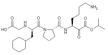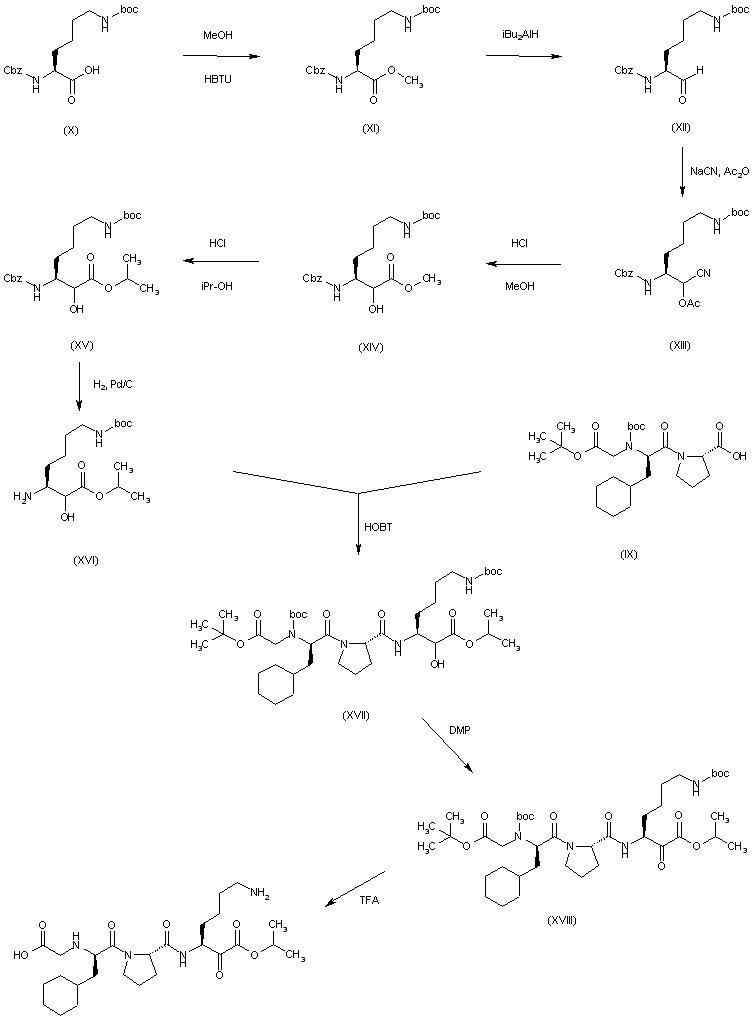 The esterification of N2-(benzyloxycarbonyl)-N6-(tert-butoxycarbonyl)-L-lysine (X) by means of BTU in dichloromethane/methanol gives the methyl ester (XI), which is reduced with iBu2AlH in dichloromethane to yield the corresponding aldehyde (XII). The reaction of (XII) with NaCN and Ac2O affords the acetylated cyanohydrin (XIII), which is hydrolyzed with HCl in ethyl ether/methanol to provide the alpha-hydroxyester (XIV). The trans-esterification of (XIV) with isopropanol and HCl gives the isopropyl ester (XV), which is N2 deprotected by means of H2 over Pd/C in DMF to yield the primary amine (XVI). The condensation of the lysine derivative (XVI) with the dipeptide intermediate (IX) by means of HOBT and DCC in DMF affords the tripeptide derivative (XVII), which is oxidized by means of DMP in dichloromethane to provide the alpha-oxo ester (XVIII). Finally, this compound is Boc-deprotected by means of TFA in dichloromethane to obtain the target alpha-oxo-tripeptide derivative.