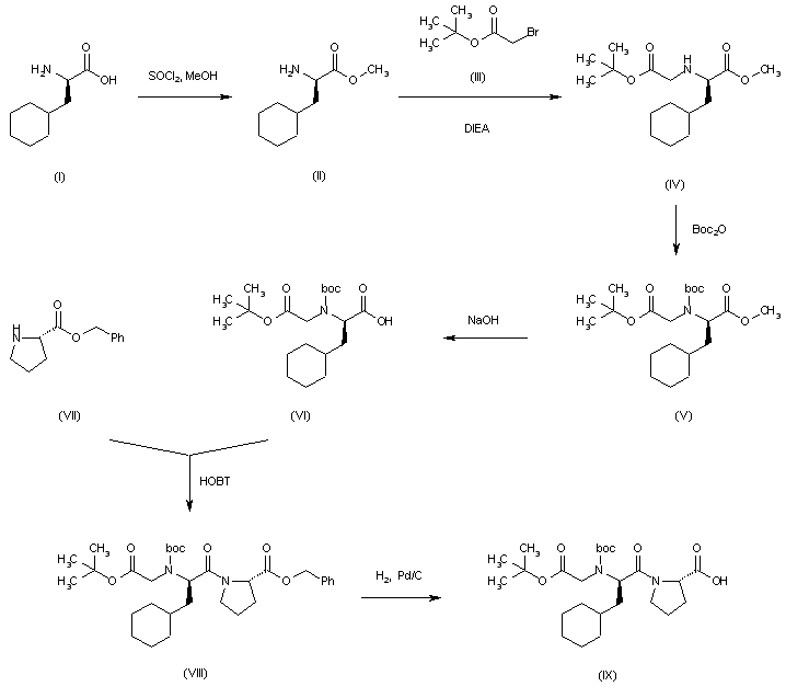 Synthesis of the dipeptide intermediate (IX): The esterification of D-cyclohexylalanine (I) by means of SOCl2 and methanol gives the methyl ester (II), which is condensed with tert-butyl bromoacetate (III) by means of DIEA in acetonitrile to yield the N-substituted cyclohexylalanine (IV). The reaction of (IV) with Boc2O and DIEA in DMF affords the N-protected compound (V), which is hydrolyzed with NaOH in dioxane/water to provide the free N-substituted cyclohexylalanine (VI). The condensation of (VI) with L-proline benzyl ester (VII) by means of HOBT and DCC in DMF gives the dipeptide (VIII), which is finally debenzylated by means of H2 over Pd/C in methanol to yield the target dipeptide intermediate (IX).