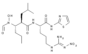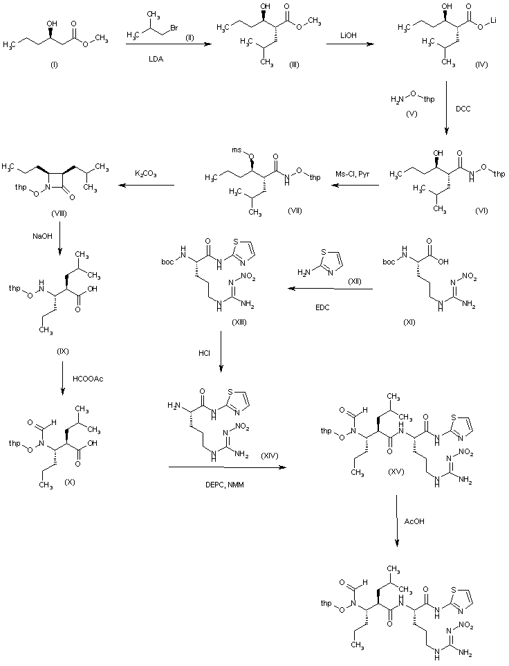 The alkylation of 3(R)-hydroxyhexanoic acid methyl ester (I) with isobutyl bromide (II) and LDA in THF gives 3(R)-hydroxy-2(R)-isobutylhexanoic acid methyl ester (III), which is hydrolyzed with LiOH in THF/MeOH/water to yield the corresponding lithium salt (IV). The condensation of (IV) with O-tetrahydropyranyl-hydroxylamine (V) by means of DCC in ethyl acetate affords the protected hydroxamic acid (VI), which is treated with Ms-Cl and pyridine to provide the mesylate (VII). The cyclization of (VII) by means of K2CO3 in refluxing acetone gives the chiral azetidinone (VIII), which is opened by means of NaOH in dioxane/water, yielding the carboxylic acid (IX). The formylation of the NH group of (IX) with acetic formic anhydride and pyridine in dichloromethane affords the intermediate (X). The condensation of the N-protected nitro arginine (XI) with 2-aminothiazole (XII) by means of EDC in DMF gives the argininamide (XIII), which is deprotected by means of HCl in dioxane to yield the intermediate (XIV). Condensation of (XIV) with (X) by means of diethyl phosphorylcyanide (DEPC) and NMM in DMF gives the protected dipeptide (XV), which is treated with AcOH in warm water to yield the target dipeptide.