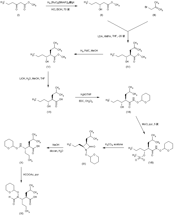 Hydrogenation of methyl butyrylacetate (I) in the presence of the chiral catalyst [RuCl2(BINAP)]2.Et3N furnished the (R)-hydroxyester (II). Alkylation of (II) with 3-bromo-2-methyl-1-propene (III) in the presence of lithium diisopropylamide gave the isobutenyl derivative (IV), which was further hydrogenated to (V) in the presence of Pd/C. After basic hydrolysis of the methyl ester of (V), the resulting carboxylic acid (VI) was coupled with 2-tetrahydropyranyloxyamine by means of EDC to provide the tetrahydropyranyl-protected hydroxamic acid (VII). Mesylation of the free hydroxyl group of (VII) to give (VIII), followed by its cyclization in the presence of potassium carbonate, gave rise to the azetidinone (IX). Opening of the lactam ring of (IX) with NaOH afforded the protected hydroxyamino acid (X). Then, formylation of the amino group with formic acetic anhydride in pyridine provided intermediate (XI).
