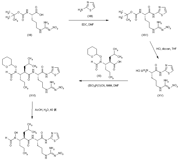 Coupling of N(alpha)-Boc-N(G)-nitro-L-arginine (XII) with 2-aminothiazole (XIII) gave amide (XIV). After cleavage of the Boc group of (XIV) with HCl, the resulting amine (XV) was coupled with the intermediate carboxylic acid (XI) using diethyl cyanophosphonate to afford adduct (XVI). The terahydropyranyl group of (XVI) was finally deprotected by treatment with aqueous acetic acid.