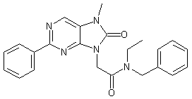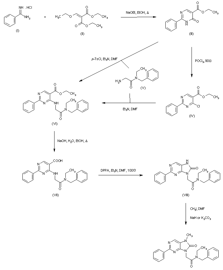 Pyrimidinone (III) was formed by condensation of benzamidine hydrochloride (I) with diethyl (ethoxymethylene)malonate (II). Subsequent reaction with glycinamide derivative (V) in the presence of p-tosyl chloride and Et3N afforded the aminopyrimidine (VI) (1). Alternatively, aminopyrimidine (VI) was prepared by chlorination of pyrimidinone (III) with POCl3, followed by displacement of the resulting chloropyrimidine (IV) with glycinamide (V) (2). Basic hydrolysis of the ethyl ester group of (VI) furnished pyrimidinecarboxylic acid (VII). This was then subjected to a Curtius rearrangement employing diphenyl phosphoryl azide (DPPA) to produce the 8-oxopurine system (VIII). Finally, N-alkylation of (VIII) with iodomethane gave rise to the title compound.