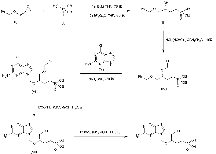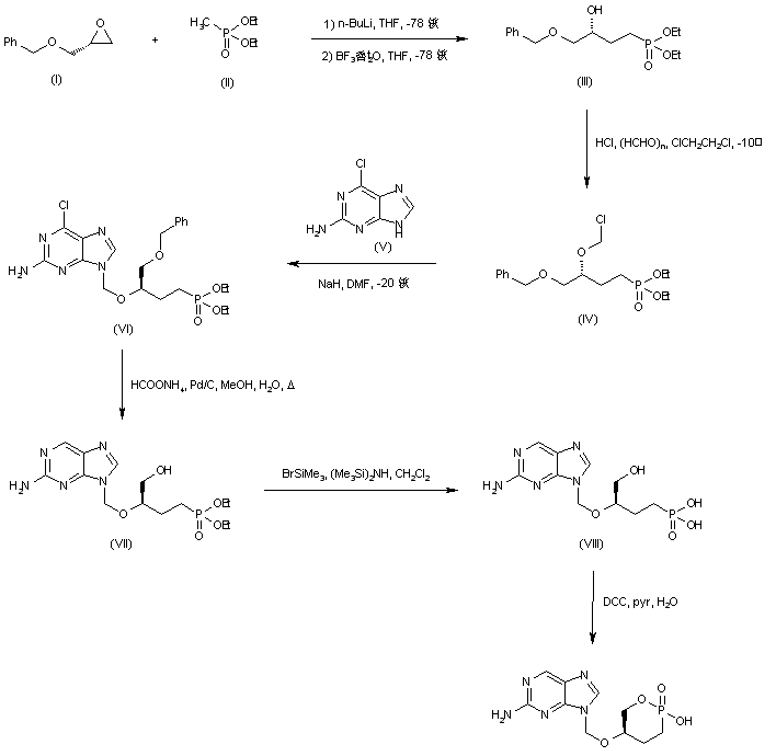 Regiospecific opening of the chiral 2-(benzyloxymethyl)oxirane (I) with lithiated diethyl methylphosphonate in the presence of boron trifluoride etherate afforded phosphonate (III). After conversion of (III) to the chloromethyl ether (IV), upon treatment with paraformaldehyde and HCl, condensation with the sodium salt of 2-amino-6-chloropurine (V) gave the nucleoside phosphonate (VI). Simultaneous hydrogenolysis of the chlorine atom and benzyl ether of (VI) by transfer hydrogenation in the presence of ammonium formate and Pd/C yielded (VII). Finally, the phosphonate ester groups of (VII) were cleaved by means of bromotrimethylsilane.