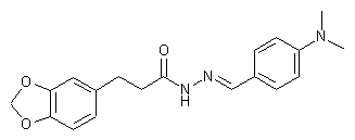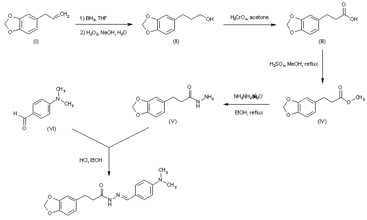 The regioselective hydroboration of safrole (I), followed by oxidative work-up, furnished the primary alcohol (II). Jones oxidation of alcohol (II) yielded carboxylic acid (III), which was subsequently esterified by means of MeOH and H2SO4. Treatment of methyl ester (IV) with hydrazine gave hydrazide (V). This was finally condensed with 4-(dimethylamino)benzaldehyde (VI) to provide the title acyl hydrazone.