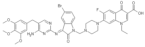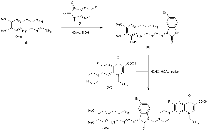 The condensation of trimethoprim (I) with 5-bromoisatin (II) in ethanolic HOAc produced the imine adduct (III). Subsequent condensation with norfloxacin (IV) and formaldehyde yielded the title Mannich base.