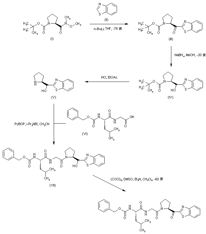 Condensation of the Weinreb amide of N-Boc-proline (I) with the lithium anion of benzothiazole (II) in THF at -78 C gave benzothiazolyl ketone (III), which was reduced with NaBH4 to afford the diastereomeric mixture of alcohols (IV). Deprotection of the Boc group of (IV) by means of HCl in EtOAc provided pyrrolidine (V). This was then coupled with Z-leucyl-glycine (VI) in the presence of PyBOP to give the peptidyl alcohol (VII). Finally, Swern oxidation of (VII) furnished the corresponding ketone.