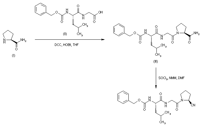 Prolinamide (I) was coupled with Z-leucylglycine (II) in the presence of DCC and HOBt to give the tripeptide amide (III). The terminal carboxamido group of (III) was then dehydrated to the corresponding nitrile by treatment with SOCl2 and N-methylmorpholine.