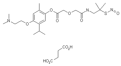 Condensation of diglycolic anhydride (I) with 1-amino-2-methylpropane-2-thiol (II) afforded amide (III). Subsequent nitrosation of the thiol group of (III) employing tert-butyl nitrite gave the nitrosothio derivative (IV). This was then condensed with 4-[2-(dimethylamino)ethoxy]-2-methyl-5-isopropylphenol (VI), prepared by basic hydrolysis of moxisylyte (V), and the resulting compound was finally converted to the succinate salt.