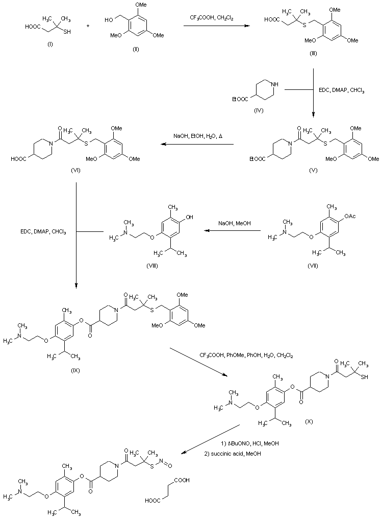 Protection of 3-methyl-3-sulfanylbutanoic acid (I) by treatment with 2,4,6-trimethoxybenzyl alcohol (II) and trifluoroacetic acid produced the trimethoxybenzyl thioether (III). Subsequent coupling of (III) with ethyl isonipecotate (IV) using EDC and DMAP gave amide (V). The ethyl ester group of (V) was then hydrolyzed to carboxylic acid (VI) by means of ethanolic NaOH. This was then condensed with 4-[2-(dimethylamino)ethoxy]-2-methyl-5-isopropylphenol (VIII), prepared by basic hydrolysis of moxisylyte (VII), and the resulting ester (IX) was deprotected with trifluoroacetic acid to give thiol (X). Finally, S-nitrosation of (X) with tert-butyl nitrite, followed by treatment with succinic acid furnished the title compound.