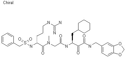 Cyclohexylalanine (XIV) was protected as the Boc derivative (XV) and then coupled with N,O-dimethylhydroxylamine to produce the Weinreb amide (XVI). Reduction of (XVI) with LiAlH4 at -78 C gave aldehyde (XVII) and subsequent addition of tert-butyl isonitrile furnished hydroxy amide (XVIII). After acid hydrolysis of (XVIII), amino acid (XIX) was protected as the N-Boc derivative (XX). This was coupled with benzodioxolylmethyl amine (XXI) yielding amide (XXII). Acid deprotection of the Boc group of (XXII) gave (XXIII), which was further coupled with dipeptide (VII) to generate tripeptide amide (XXIV). Following hydrogenolytic deprotection of the N-nitro group of (XXIV), Swern oxidation of the alcohol group gave rise to the title compound.
