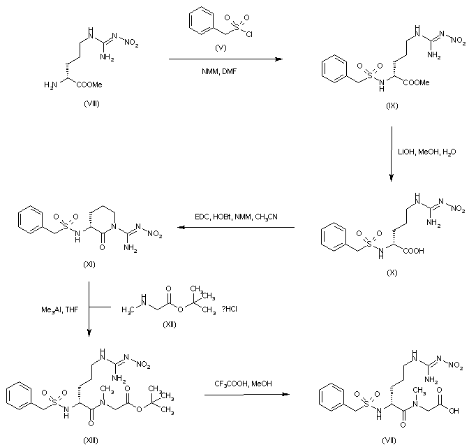 Coupling of Boc-d-nitroarginine (I) with sarcosine methyl ester (II) in the presence of EDC and HOBt gave dipeptide (III). Subsequent deprotection of the Boc group of (III) afforded amine (IV), which was coupled with benzylsulfonyl chloride (V), yielding sulfonamide (VI). Then, saponification of the methyl ester of (VI) with LiOH furnished carboxylic acid (VII).