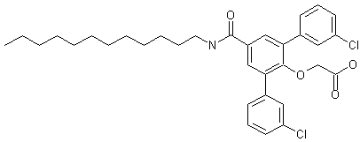 Bromination of ethyl 4-hydroxybenzoate (I) by means of N-bromosuccinimide and HBF4.Et2O produced ethyl 3-bromo-4-hydroxybenzoate (II), which was further iodinated to (III) employing I2 and K2CO3. Subsequent condensation of (III) with ethylene glycol under Mitsunobu conditions afforded (hydroxyethyl)ether (IV). Palladium-catalyzed coupling of (IV) with 3-chlorophenylboronic acid (V) gave rise to terphenyl derivative (VI). Amide (VII) was then obtained by treatment of ester (VI) with n-dodecylamine in the presence of butyllithium. Finally, alcohol (VII) oxidation using N-methylmorpholine-N-oxide and tetrapropylammonium perruthenate furnished the title carboxylic acid.