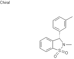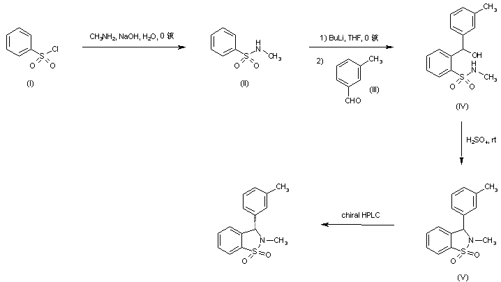 Reaction of benzenesulfonyl chloride (I) with methylamine afforded sulfonamide (II). Regioselective ortho lithiation of (II) with n-butyllithium, followed by condensation with 3-methylbenzaldehyde (III) gave carbinol (IV), which was cyclized to the sultam (V) by treatment with concentrated H2SO4. The desired (S)-enantiomer was finally isolated by chiral HPLC.