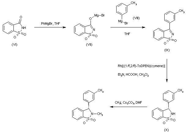 An enantioselective synthesis of the desired (S)-isomer was further developed starting from saccharin (VI). After conversion to the magnesium amide enolate (VII) by means of phenylmagnesium bromide, addition of Grignard reagent (VIII) produced the aryl sulfonimide (IX). Enantioselective reduction to the (S)-sulfonamide (X) was then accomplished using a chiral rhodium catalyst. Then, N-methylation of (X) with yodomethane in the presence of Cs2CO3 provided the title compound.