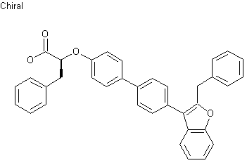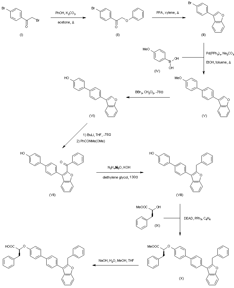 Condensation of 4-bromophenacyl bromide (I) with phenol in the presence of potassium carbonate produced phenoxyacetophenone (II), which was cyclized to benzofuran (III) upon treatment with polyphosphoric acid in refluxing xylene. Suzuki coupling of (III) with 4-methoxybenzeneboronic acid (IV) gave the biphenyl benzofuran (V). The phenolic derivative (VI) was prepared by demethylation of ether (V) with boron tribromide. Lithiation of (VI) with n-butyllithium, followed by addition of N-methoxy-N-methyl benzamide afforded ketone (VII), which was converted to the benzyl benzofuran (VIII) by means of a modified Wolff-Kishner reduction. Coupling of (VIII) with methyl (S)-3-phenyllactate (IX) under Mitsunobu conditions furnished the corresponding ether (X). The methyl ester group of (X) was finally hydrolyzed with NaOH to yield the title carboxylic acid.